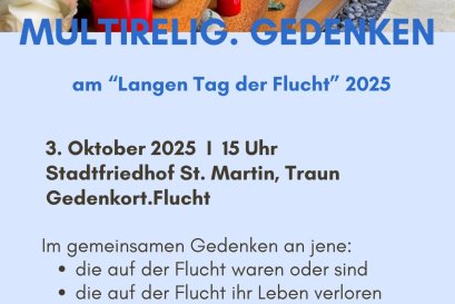 Multirelig. Gedenkfeier mit passenden Texten aus verschiedenen Religionen (zum Thema Flucht, Tod, Hoffnung ...); Gedenkritual für jene , die auf der Flucht verstorben sind; Live-Musik